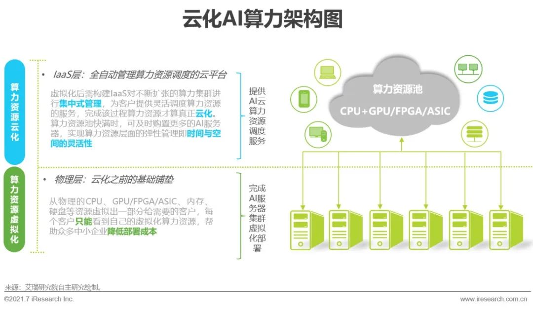 AI是一种高资源消耗、强计算的技术,AI算力的强弱直接关联到AI模型训练的精度与实时推理的结果。若企业独立部署AI算力,不仅需要建设或租用机房这类重资产与网络宽带资源,还需要购置物理机、内存、硬盘等硬件设备,而且购置设备存在采购周期不确定、硬件资源过度铺张、专业管理团队缺乏等问题。所以,独立部署AI算力资源是一项耗时耗力的工作。将AI算力云化是一种高效能、低成本的有力解决方案。具备先天性业务优势的云服务商搭建数据中心,先将AI服务器算力资源虚拟化,开放给AI模型开发者,做到按需分配,如给短视频业务的开发者优先配备CPU+GPU方案,而后对算力资源的调度工作进行统一管理。由此,“物美价廉”的算力有序注入各行各业的AI模型中,减轻了井喷式数据爆发所带来的模型训练负担,并能及时根据用户使用情况弹性扩充或缩减虚拟算力资源空间,达到方便、灵活、降本增效的效果。